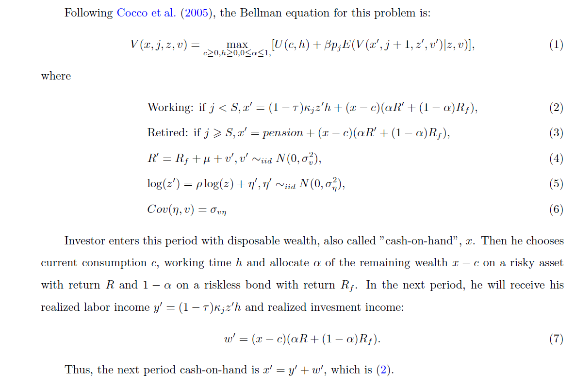 This model basically takes from Cocco et al.(2005) and I modify it to be close to the basic setting in VFI toolkit. It is about lifetime consumption and portfolio choice.