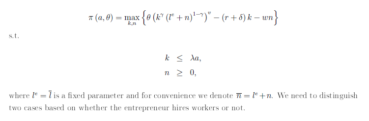 I’d like to share on the forum some simple thoughts on solving models with entrepreneurs. Examples of heterogeneous agents models with entrepreneurs are, among many others,